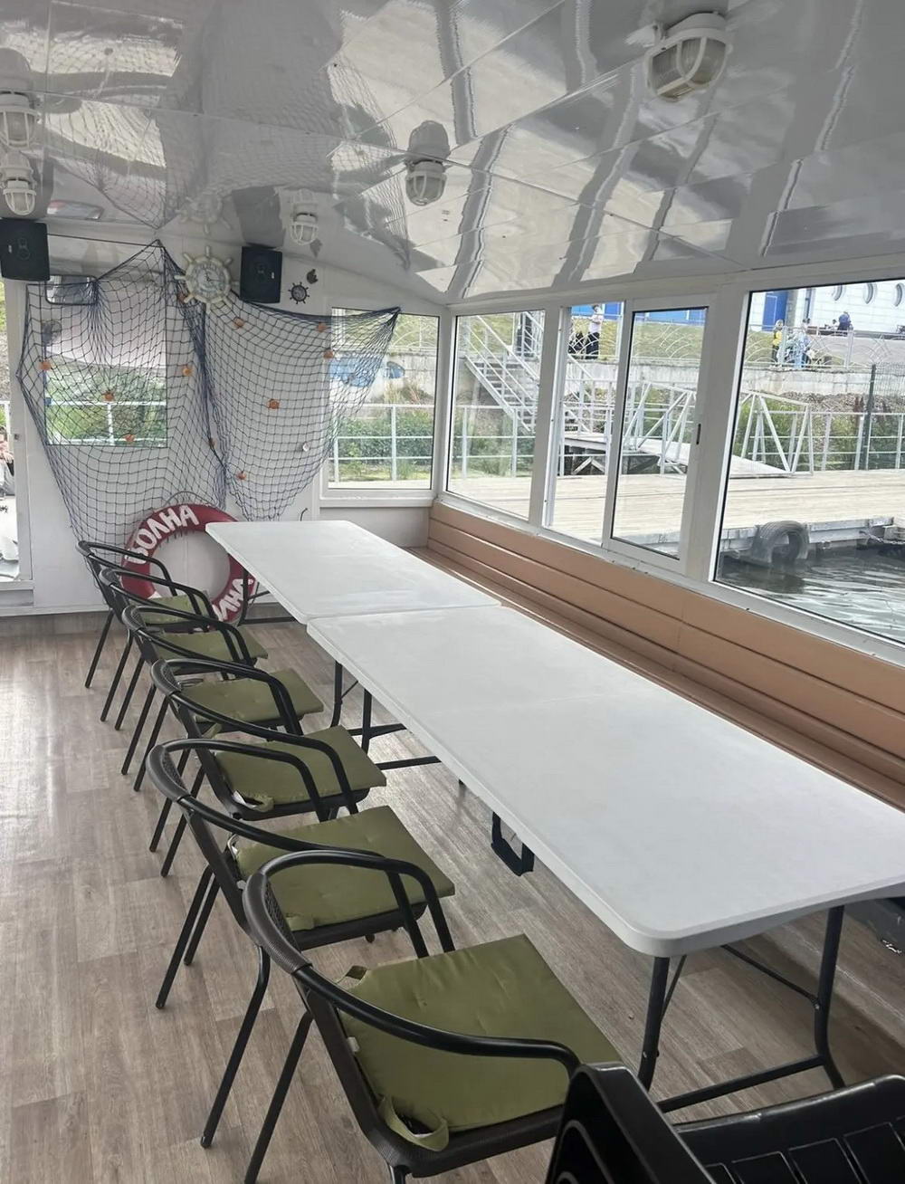 На кораблике не страшно оказаться в любую непогоду. Кораблик оснащен раздвижными окнами, которые защитят от дождя или ветра